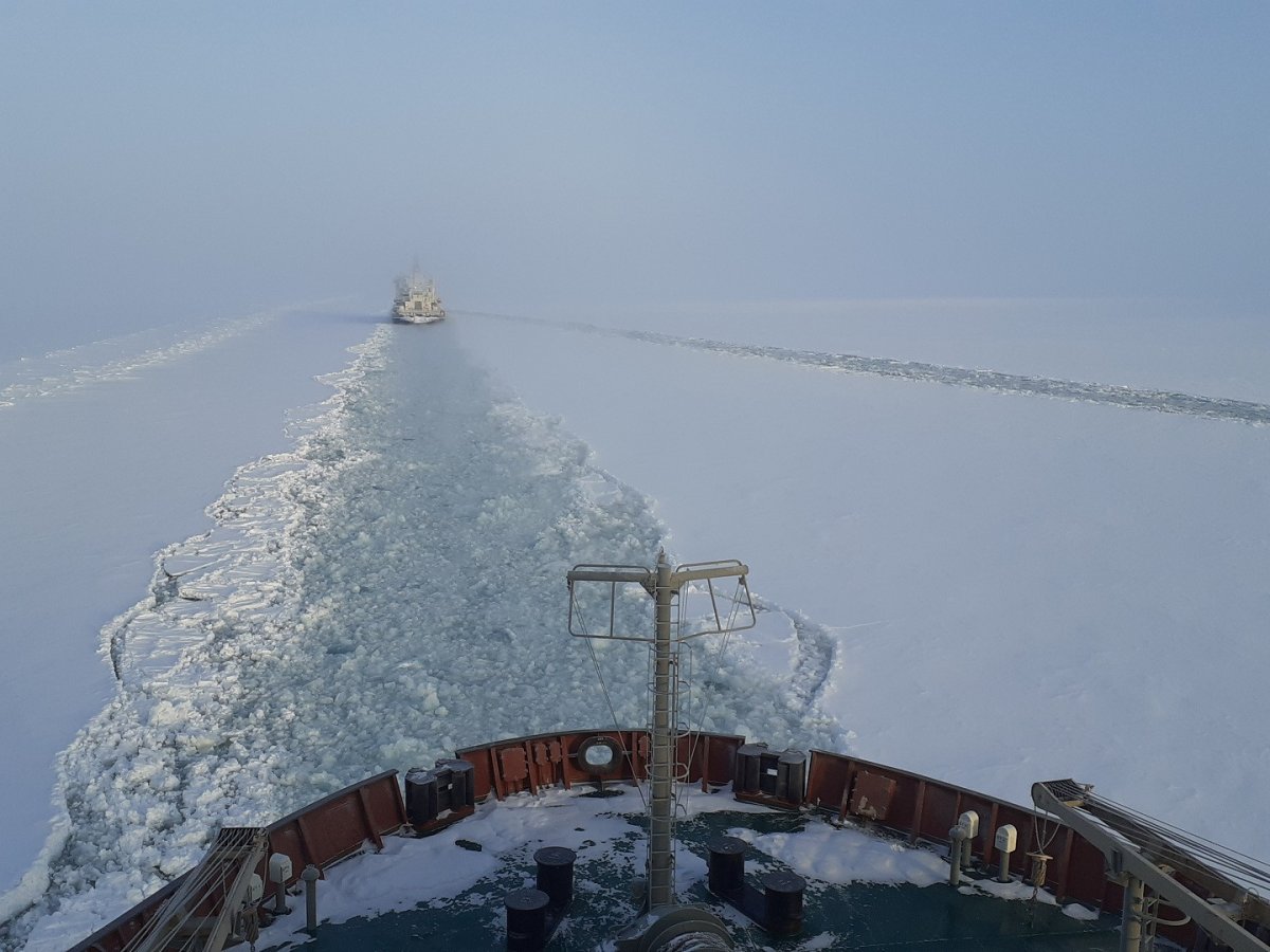 В данный момент лихтеровоз "Севморпуть" движется в Мурманск под проводкой ледокола "Вайгач". В порту он встанет к причалу под погрузку очередной партии материалов для проекта "Восток Ойл".