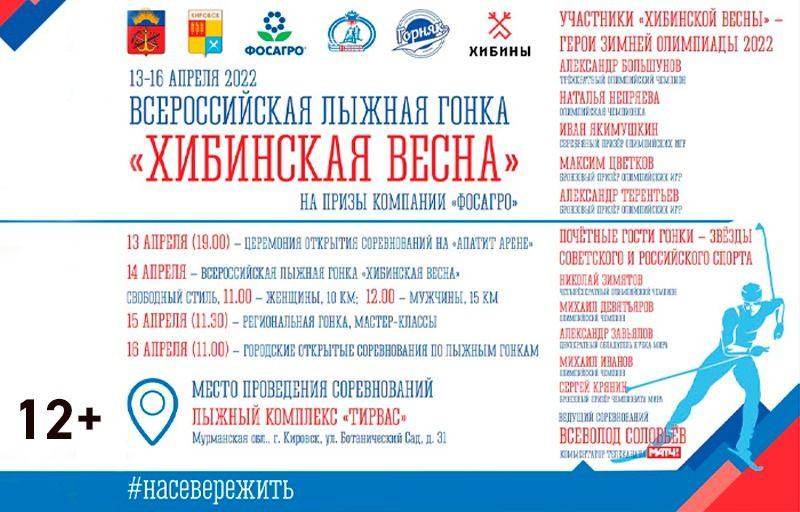 Торжественное открытие “Хибинской весны” состоится 13 апреля в Ледовом дворце «Апатит Арена», а сама гонка пройдет 14 апреля на трассах лыжного комплекса “Тирвас”. Он был открыт в 2015 году и сегодня имеет освещённые, сертифицированные FIS трассы на 5 и 10 км. В рамках соревнований здесь состоятся масс-старты на 10 и 15 км свободным стилем. Женщины пробегут дистанцию – 10 км., мужчины – 15 км.