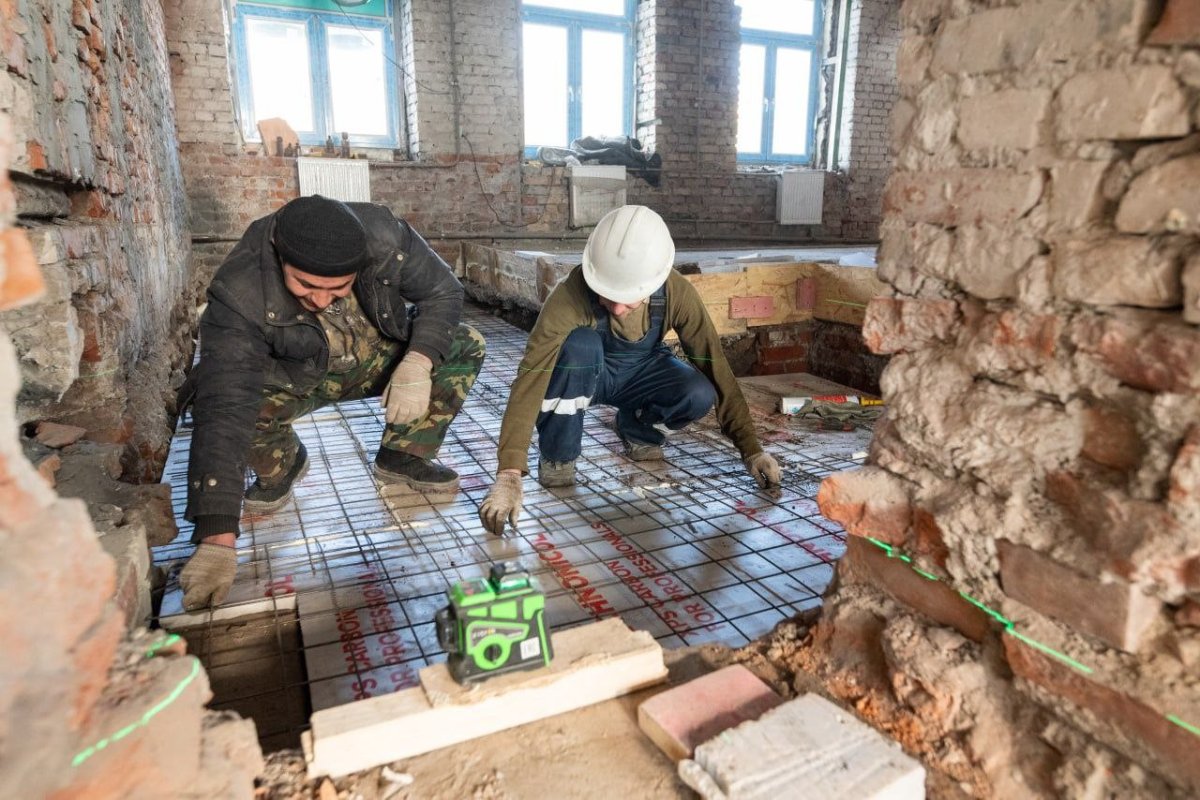 На фото: рабочие устанавливают каркас для пола в школе №1 Мурманска