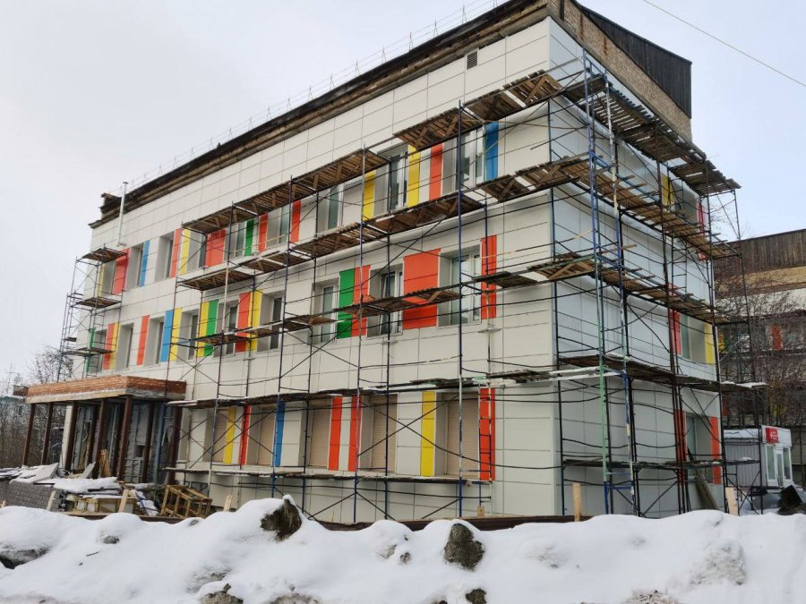 Капитальный ремонт фасадов зданий городской детской поликлиники №1 завершается в Мурманске. Теперь фасад дома на улице Папанина, 1 по цветовой гамме перекликается с фасадом на улице Полярные Зори, 36, так как оба здания детской поликлиники выполнены в едином красочном стиле.