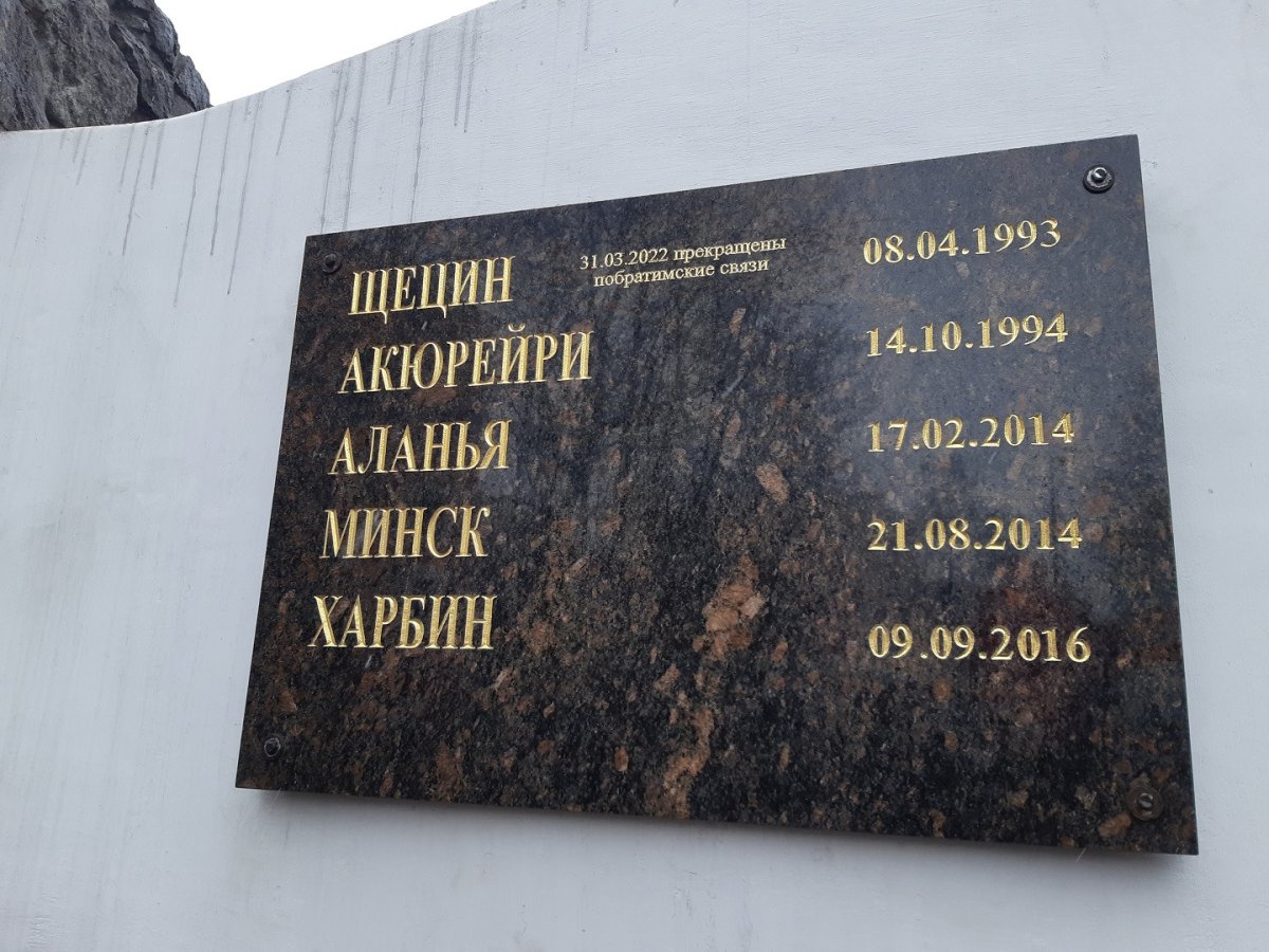 В Мурманске внесли коррективы в памятный знак "Города-побратимы города Мурманска". На правой плите "Чебурашки" возле города Щецин появилась надпись "31.03.22 прекращены побратимские связи".