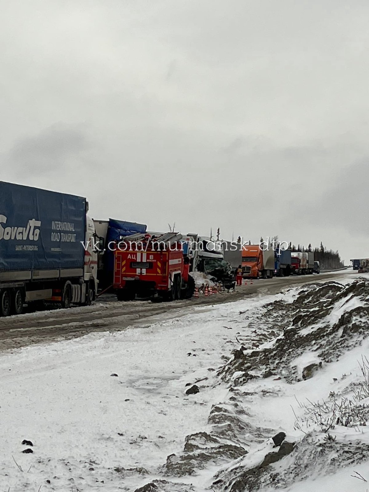 Утром в районе 1 236 километра автодороги Р-21 “Кола” между Апатитами и Мончегорском произошло столкновение двух грузовых автомобилей Volvo и Iveco.