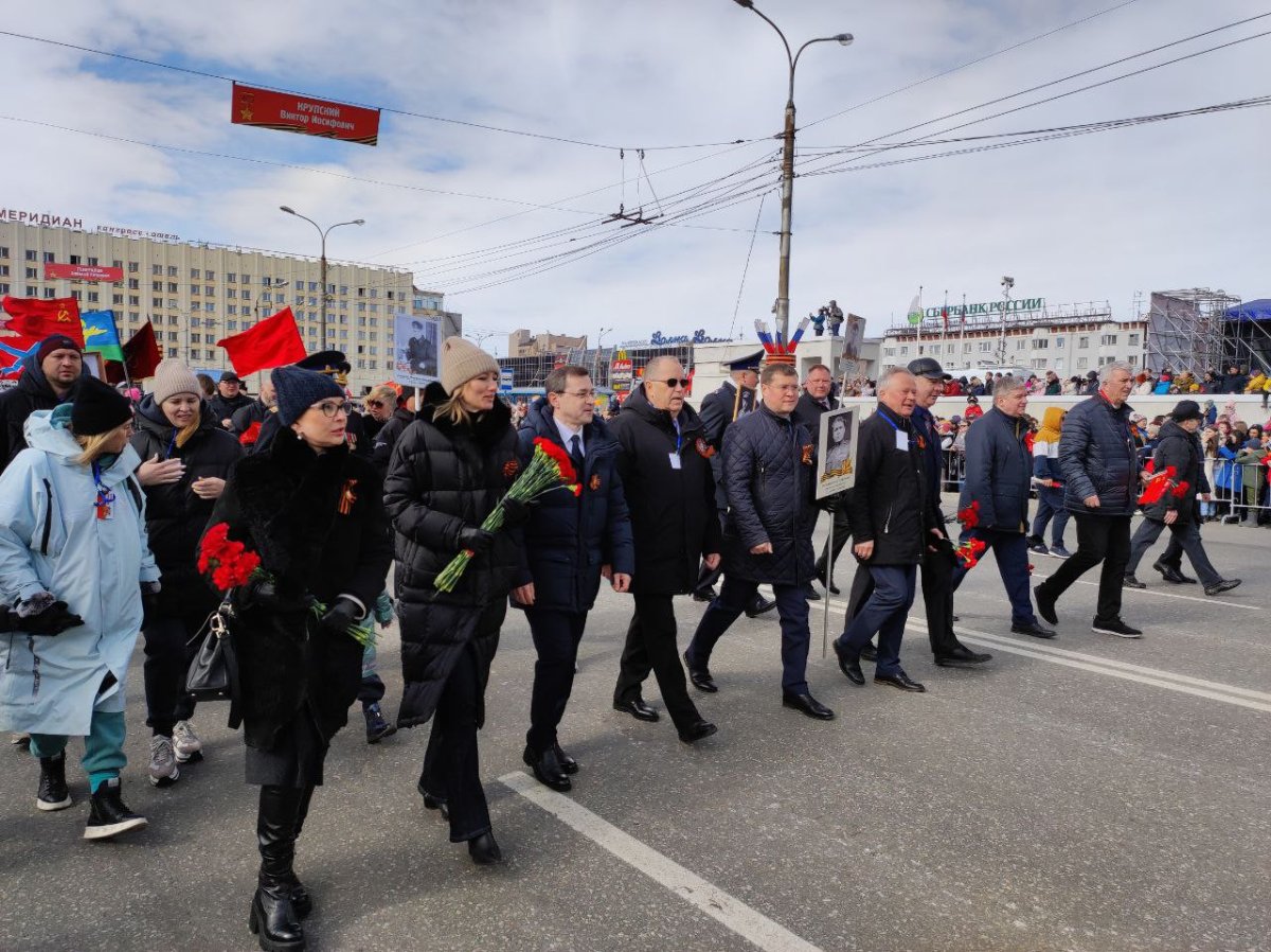 На фото: Юрий Сердечкин идет в праздничной колонне с портретом Петра Охотникова