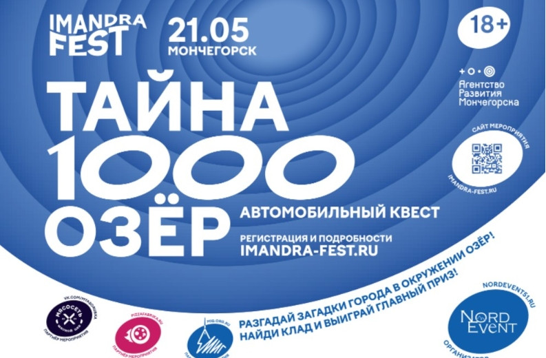Масштабный фестиваль Imandra Fest, организованный Агентством развития Мончегорска, продолжается. Уже 21 мая в Мончегорске состоится увлекательный командный автомобильный квест «Тайна 1000 озёр».