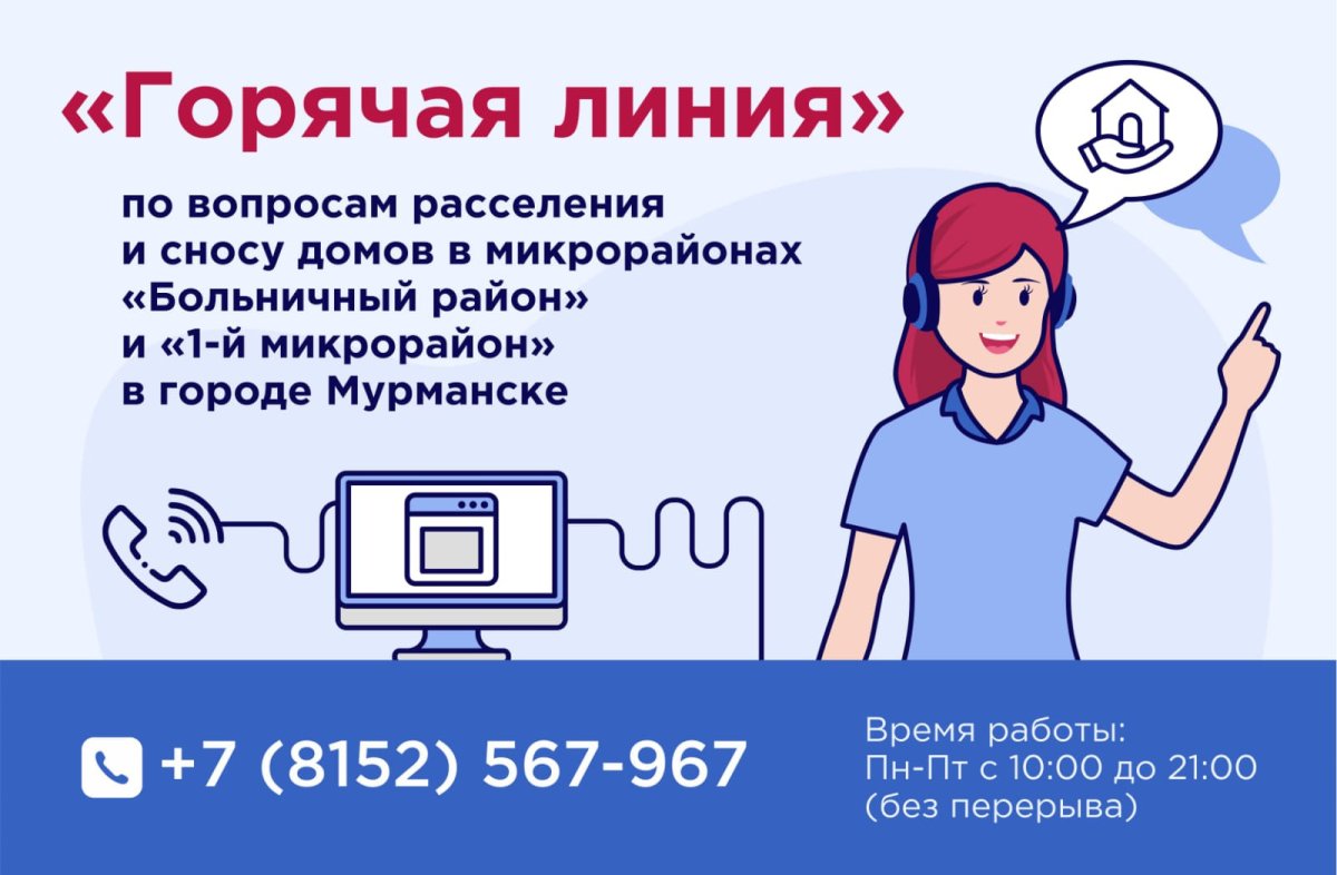 "Горячая линия" организована для жителей Больничного городка и первого микрорайона в Мурманске, чьи дома подлежат расселению и сносу. Звонки принимаются в Центре содействия жилищному строительству Мурманской области, сообщает профильное региональное министерство.