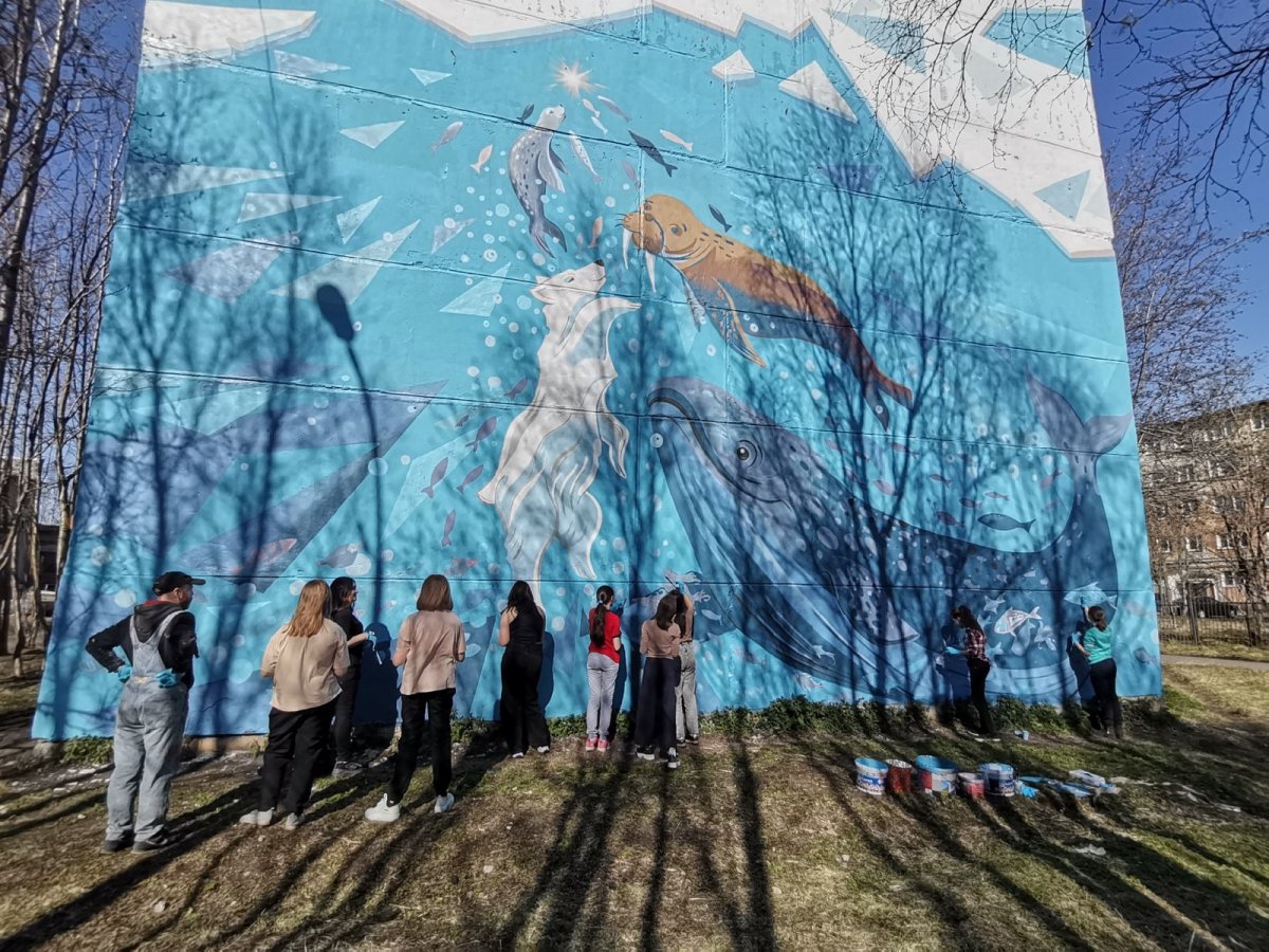 Первый в этом сезоне мурал появился на фасаде школы спортивной борьбы в Ленинском районе Мурманска на улице Невского, 93. Об этом сообщает минград региона.