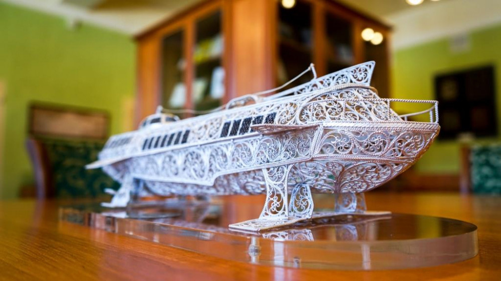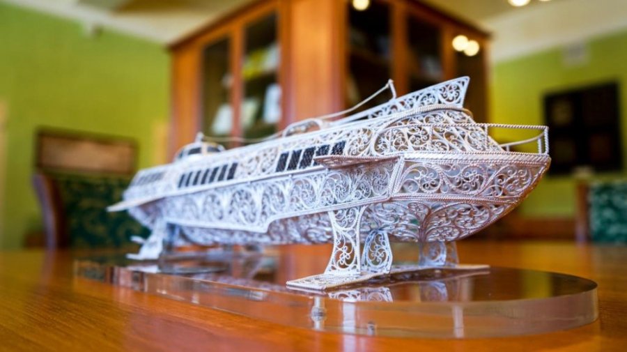 Почетный символ представляет собой модель судна "Метеор". Она украшена казаковской филигранью - ажурным узором из тонкой серебряной проволоки. Такие произведения искусства создают в селе Казаково под Нижним Новгородом.
