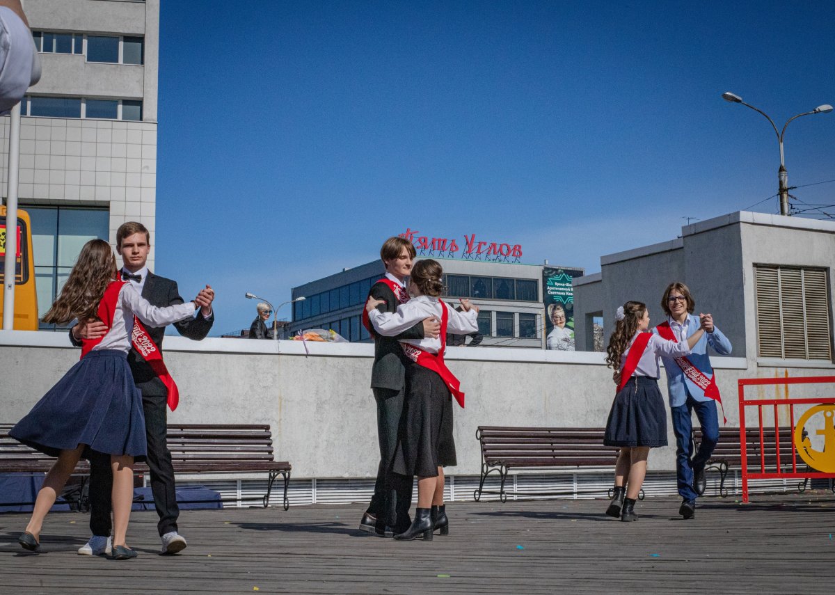 На фото: Выпускники танцуют школьный вальс в центре Мурманска