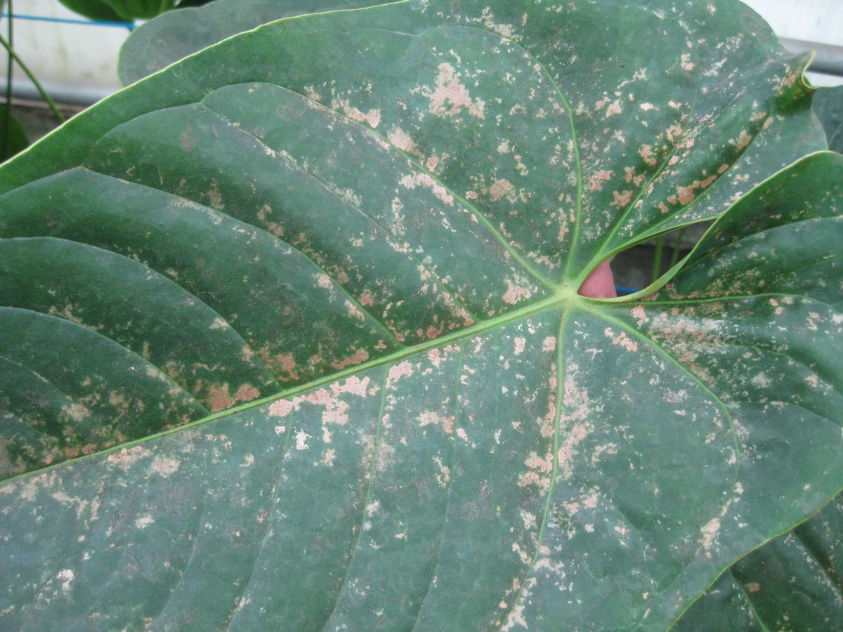 листьях растений появляются светлые пятна различной величины и формы. При питании взрослых трипсов появляется так называемая серебристая штриховатость. Эта штриховатость представляет собой ряды мелких пятен, серебристый цвет которых возникает из-за попадания воздуха внутрь разрушенных тканей растения. Личинки трипсов вызывают повреждения другого вида - возникают более крупные бесцветные пятна, которые, сливаясь, могут быстро переходить в некротические участки на листьях.