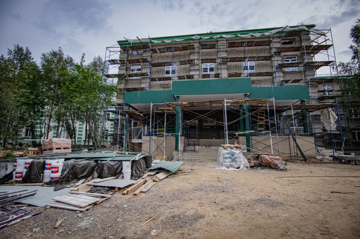 Сейчас подрядчик осуществляет ремонт крыши, наносит штукатурку и теплоизоляционный слой на главный фасад, а также строит новое центральное крыльцо. До конца лета рабочие должны завершить все строительные наружные работы - фасад, кровлю, спортивную площадку и благоустройство прилегающей территории.