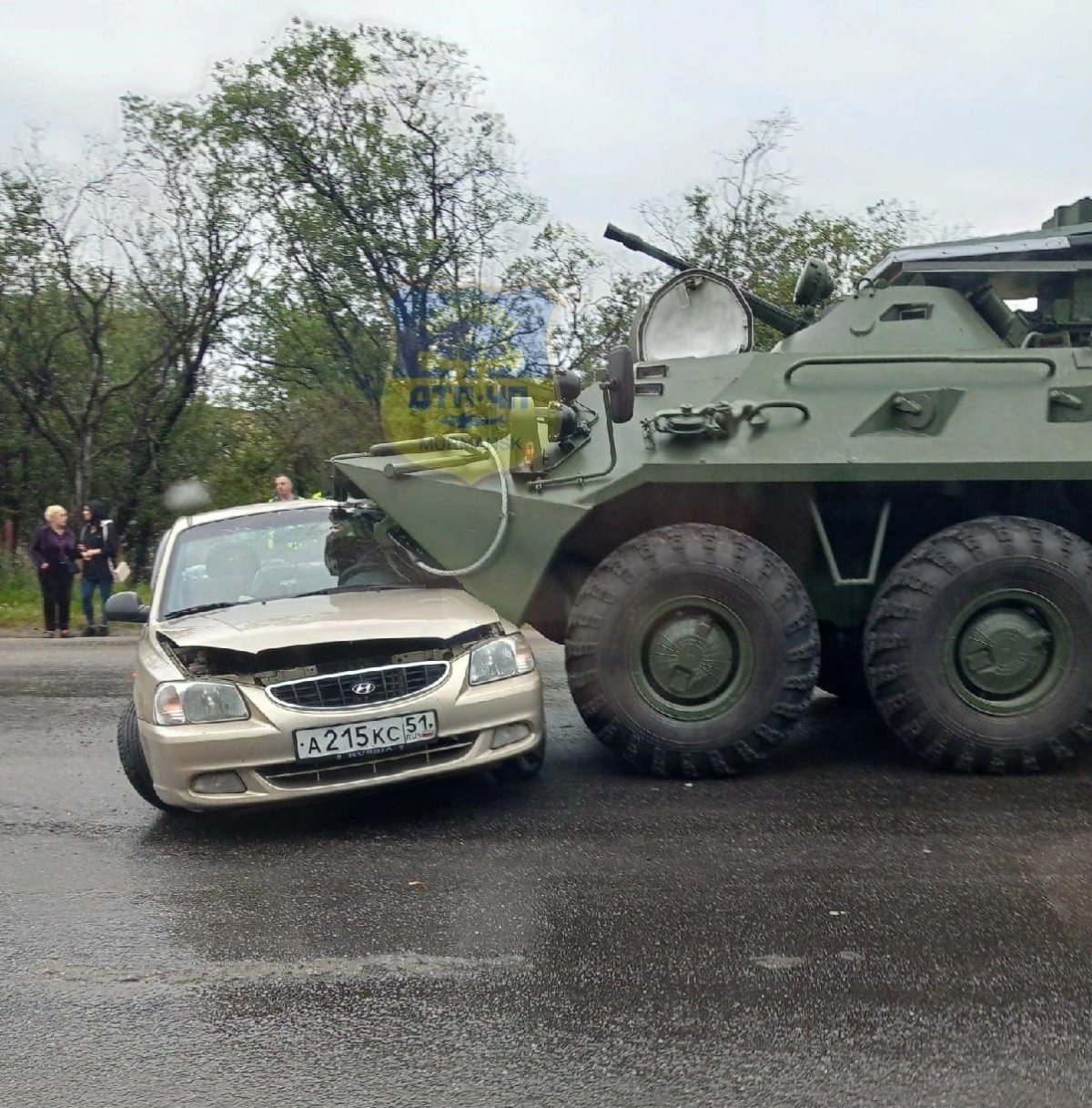 В Североморске произошло необычное ДТП. Бронетранспортёр врезался в легковой автомобиль Hyundai.