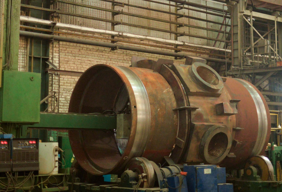 Закончена автоматическая наплавка антикоррозионного покрытия на внутренней поверхности детали корпуса – обечайке с патрубками. Она выполняется ленточным электродом под слоем флюса с производительностью в среднем 24 кг наплавленного металла в час. Процесс автоматической наплавки длится, как правило, 21 день. Работы ведутся непрерывно в три смены. Общая масса наплавленного металла составляет примерно 1,5 тонны. Антикоррозионная наплавка обеспечит защиту основного металла в течение всего ресурса эксплуатации оборудования.
