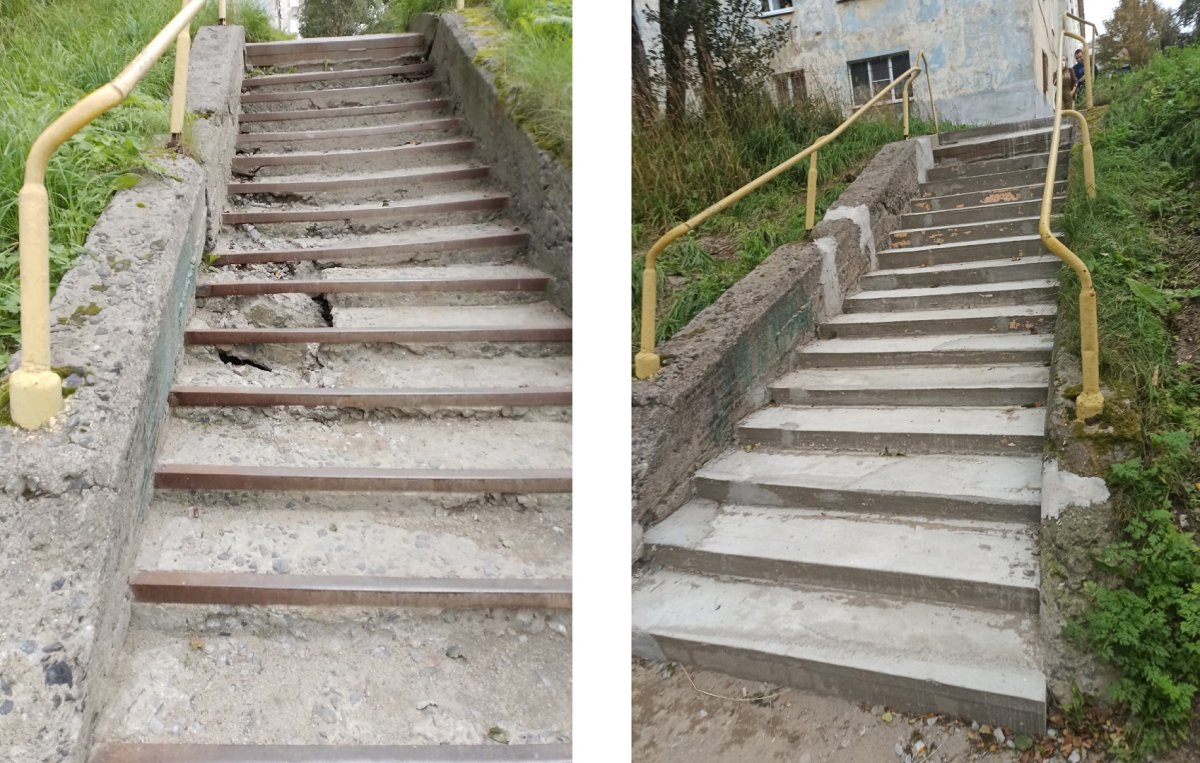 На фото: лестница у дома №50 на улице Лобова до и после ремонта