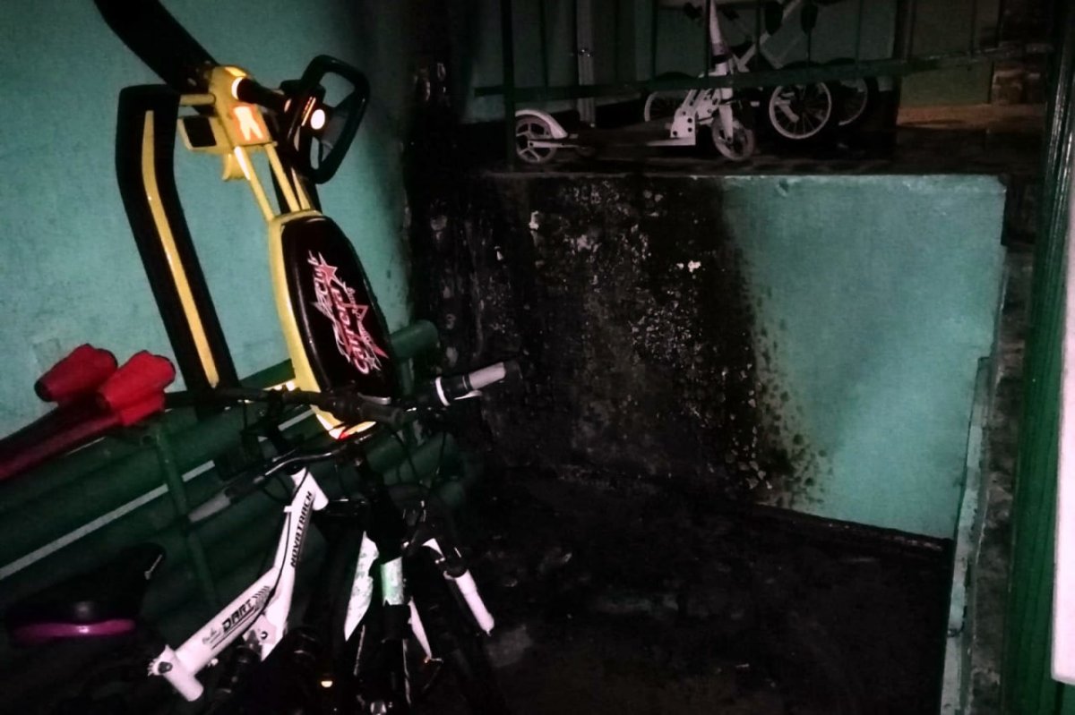 Огонь повредил личные вещи, которые оставляли на лестничной клетке жильцы дома – велосипед, самокаты, снегокаты и детские коляски. Кроме того, закоптились стены и потолок.