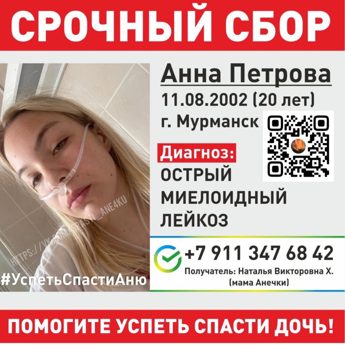 О тяжелой форме своего диагноза Анна узнала 5 августа. Петрову лечили капельницами, таблетками, переливанием крови, тромбоцитов и плазмы. 13 августа ее вместе с матерью Натальей отправили авиацией в институт гематологии в Москву. Специалисты подтвердили диагноз и сообщили, что единственный шанс спасти Анну – трансплантировать костный мозг. В сентябре стало известно, что квоты на эту процедуру закончились до декабря.