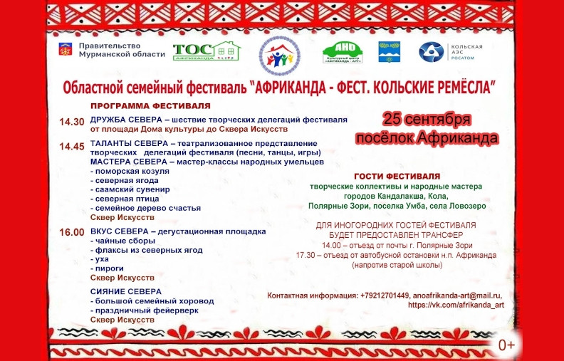 Областной семейный праздник народной культуры «Африканда-Фест. Кольские ремесла» пройдет 25 сентября возле города Полярные Зори (н.п. Африканда, сквер Искусств). В программе фестиваля – выступления творческих коллективов, народных мастеров Полярнозоринского, Терского, Кольского, Ловозерского и Кандалакшского районов.