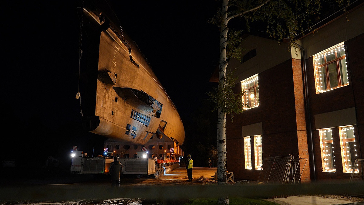 Вечером субботы, 8 октября, под корму АПЛ завели самоходные оси, а ближе к полуночи подлодка выдвинулась с территории терминала "Моби Дик", прошла по улицам Кронштадта мимо окон жилых домов и вышла на Кронштадтское шоссе. Там на дублере кормовая часть "Ленинского комсомола" остановилась на "дневку", чтобы завершить свой путь до здания музея следующей ночью.