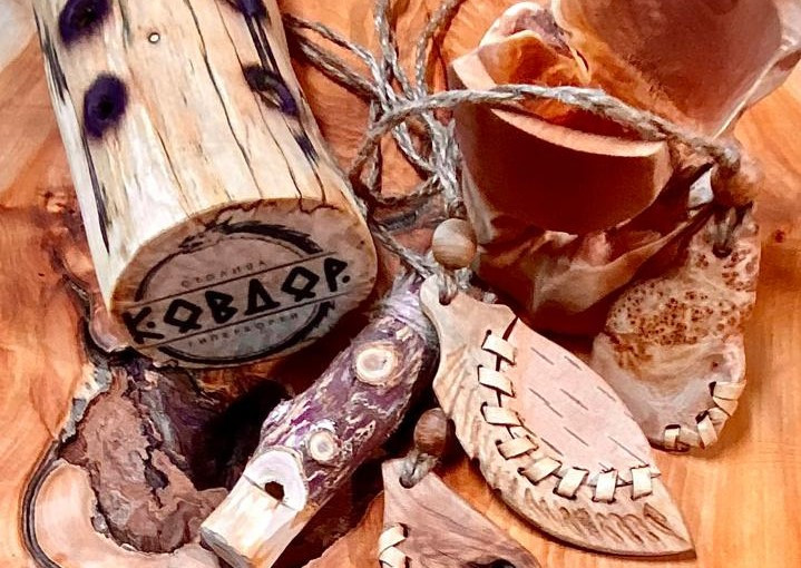 В этом капе Алексей Махеев увидел на срезе удивительный по красоте древесный узор. Он-то и вдохновил сделать из капа подвески, заплести их берестой. Вот и получился гиперборейский сувенир — победитель конкурса MURMANSK.TRAVEL SOUVENIR.