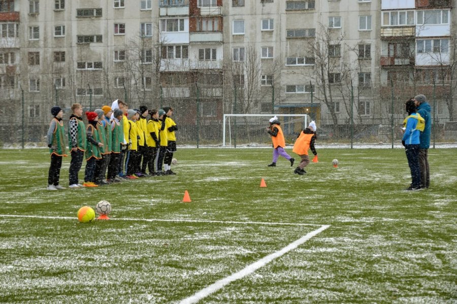 Фото: дети играют в футбол в снежную погоду