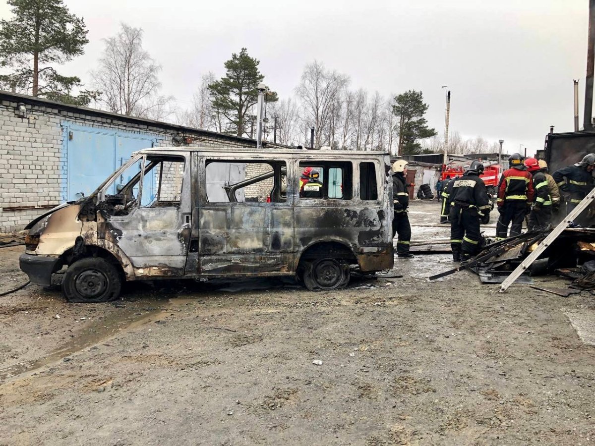 Один гараж выгорел изнутри на площади 45 "квадратов", рядом сгорела пристройка. Второй гараж закопчен по всей площади, сгорела крыша. Огонь уничтожил микроавтобус.