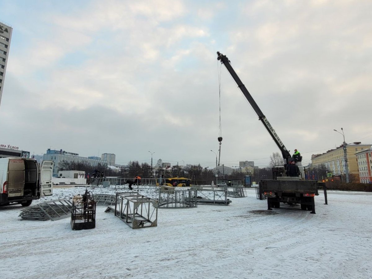 На фото: Рабочие монтируют каркас главной новогодней елки Кольского Заполярья
