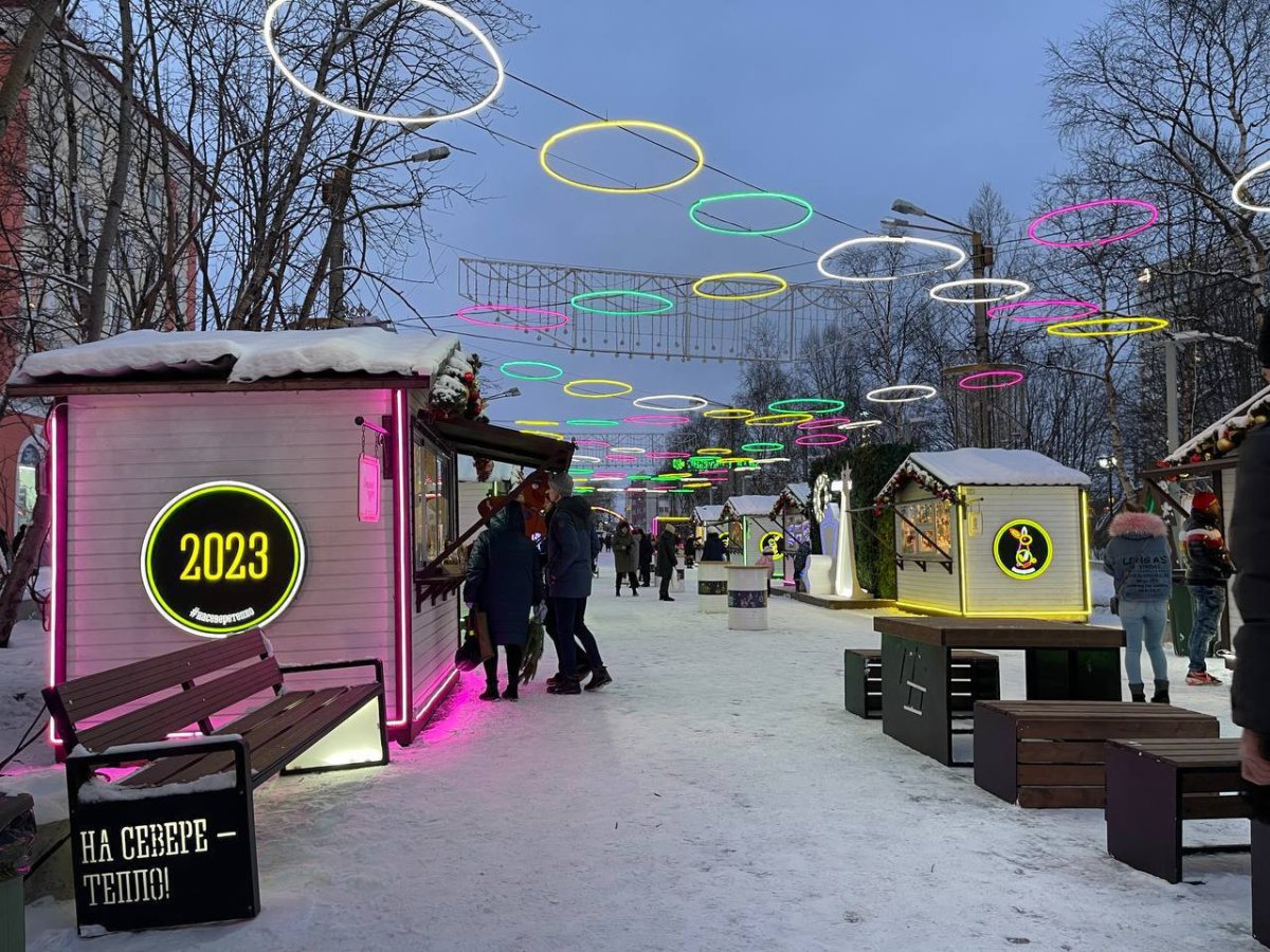 В центре Мурманска 24 декабря открылась новогодняя ярмарка "На Севере - тепло". На улице Воровского традиционно разместились торговые домики, игровые зоны для детей и фотозоны.