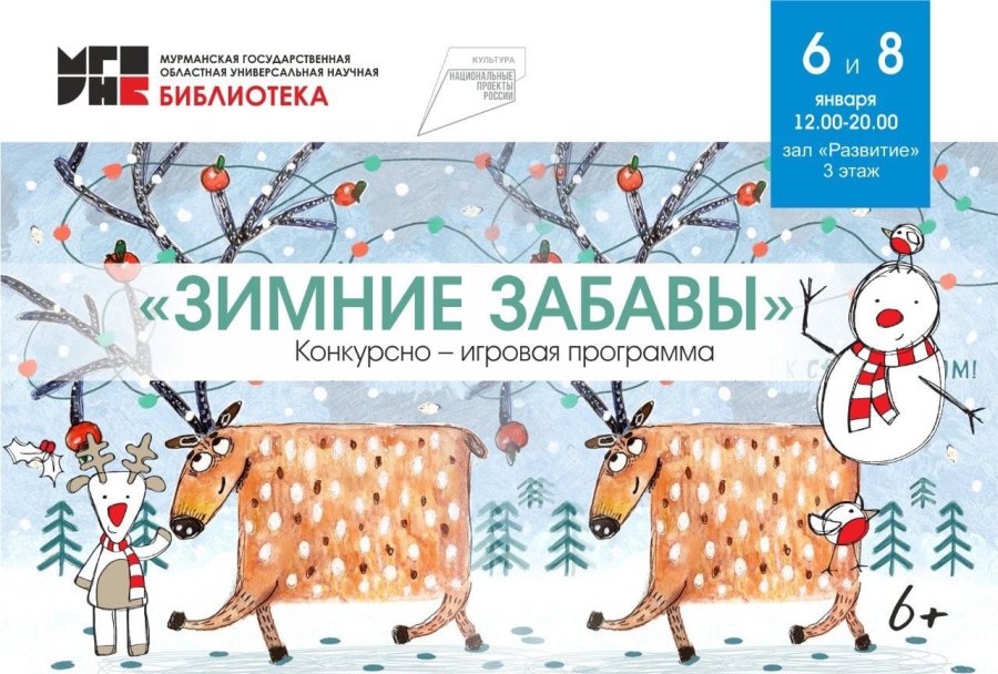 В Мурманской областной научной библиотеке состоится конкурсно-игровая программа "Зимние забавы". В рамках мероприятия участникам расскажут о новогодних традициях разных стран, проведут викторину по темам зимы и Рождества. Гости программы также спомнят веселые зимние песни, отгадают загадки и ребусы, совершат путешествие по сказкам про Новый год и зиму.