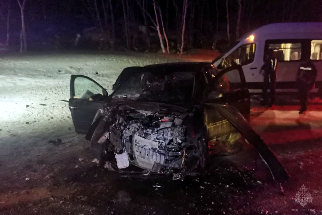 В субботу, 21 января, на 7 км автодороги Североморск – Североморск-3 произошло лобовое столкновение двух машин. По предварительной информации, легковой автомобиль Ford Focus выехал на полосу встречного движения в зоне действия запрещающего знака "Обгон запрещён" и врезался в грузовой фургон Ford Transit.
