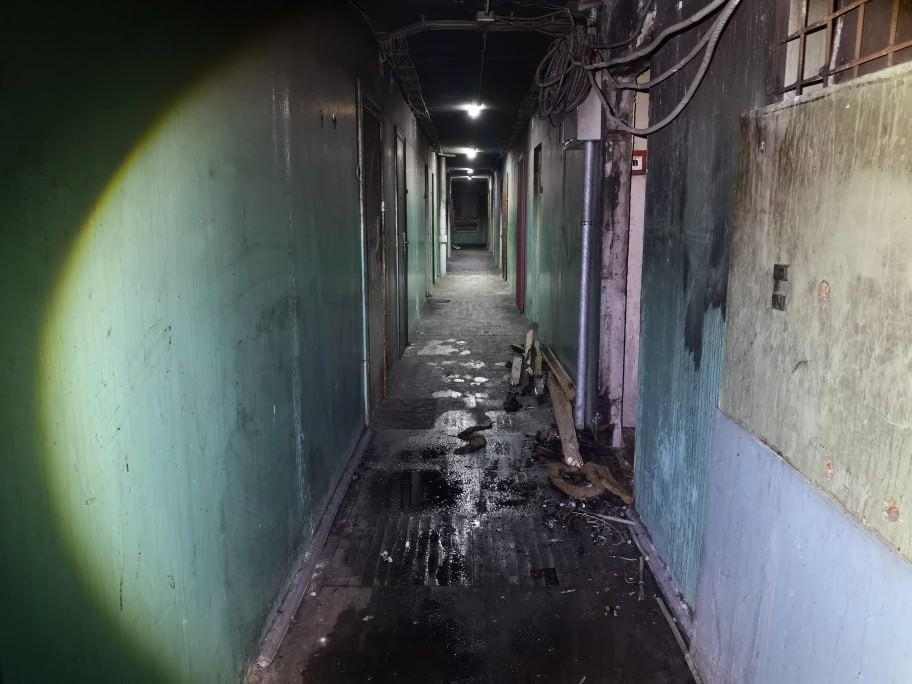 В комнате на пятом этаже огонь повредил входную дверь и дверную коробку. В соседней комнате сгорела кровать и вещи домашнего обихода, закопчены стены и потолок в обеих комнатах по всей площади.