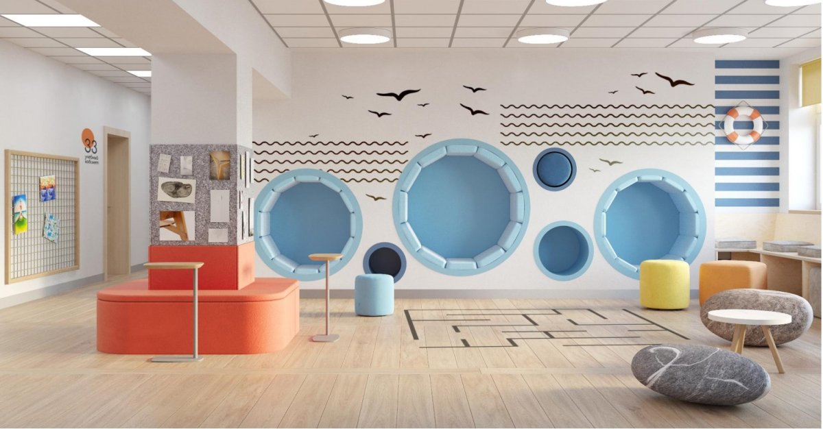 В основе преображения школы лежит концепция “Город у Белого моря”. В эскизном решении проекта визуализированы обновленные помещения образовательной организации. В коридорах появятся много пуфиков и мест, где можно присесть и отдохнуть.