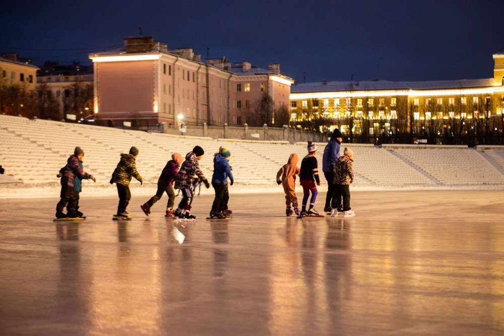 На Центральном стадионе в Мурманске залили лед. Воспитанники отделения конькобежного спорта СШОР №4 впервые за учебный год смогли потренироваться.