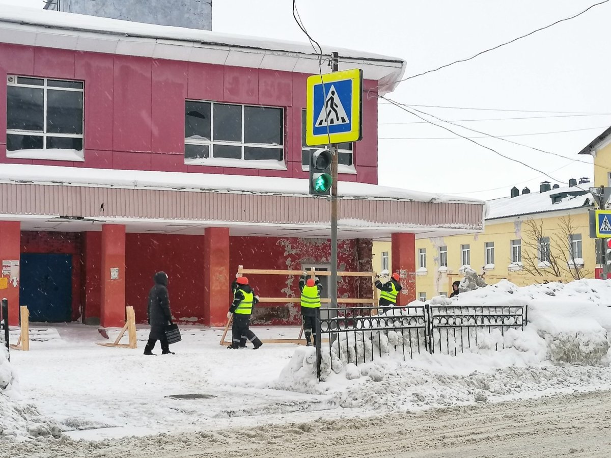 Рабочие устанавливают ограждения вокруг "Большевика"