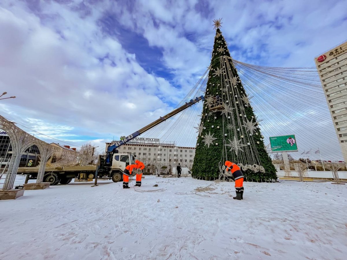 Рабочие снимают украшения с елки и убирают иллюминацию