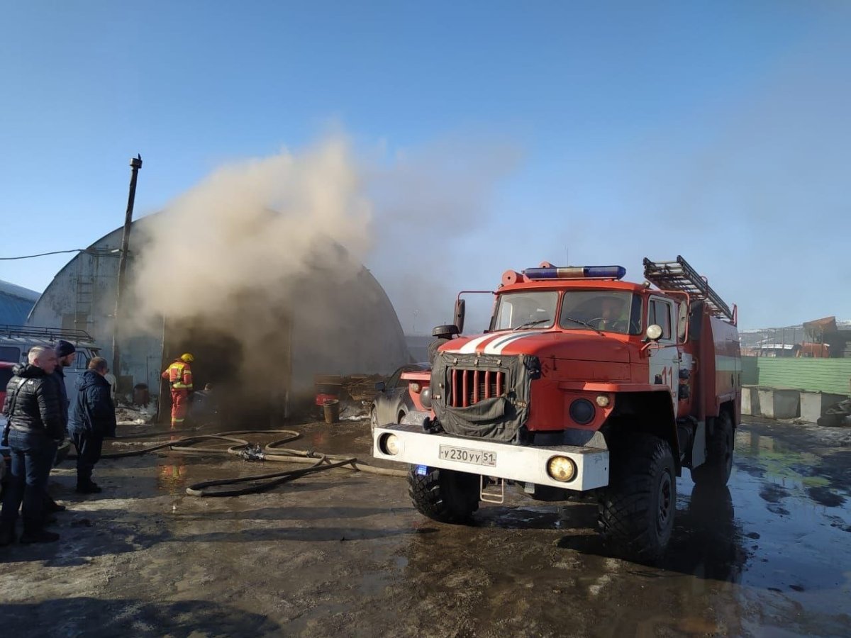 В Мурманске к тушению пожара в ангаре на Героев-североморцев, 100а, который случился около 14 часов 7 апреля, были привлечены 24 спасателя и 7 единиц техники. Пожару был присвоен повышенный ранг - 1-БИС.
