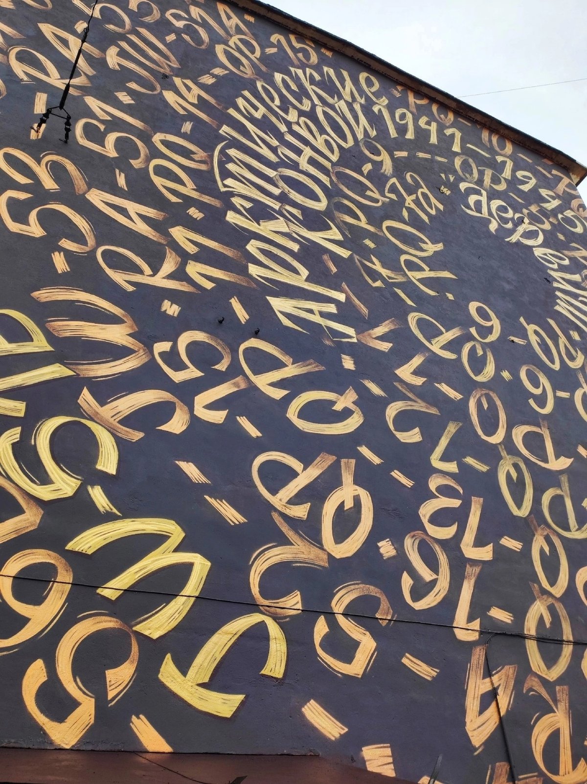 Мурал приурочен ко Дню Победы. На нём изображены номера арктических конвоев, которые доставляли грузы по ленд-лизу в СССР в году Великой Отечественной войны.