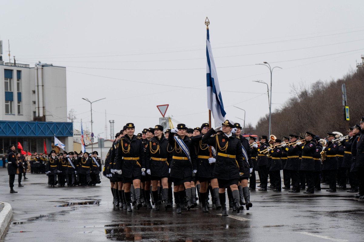 Торжественное шествие войск на Приморской площади открыл взвод барабанщиков Североморского кадетского корпуса. Юные музыканты задали темп и ритм парадных расчетов. По площади прошли парадные расчеты штаба и управления Северного флота, ракетного крейсера “Маршал Устинов”, сводный парадный расчет первой дивизии противовоздушной обороны, 63-го отдельного морского инженерного полка, 12-го Главного управления Министерства обороны Российской Федерации, сводного расчета военнослужащих женщин 741-го Центра связи, 701-го Центра материально-технического обеспечения сил Северного флота и 45-ой армии ВВС и ПВО.
