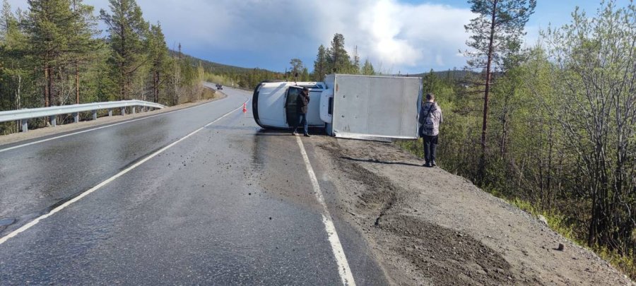 Днём 29 мая под Апатитами перевернулся грузовой автомобиль. ДТП произошло на 15 км автоподъезда к городу.