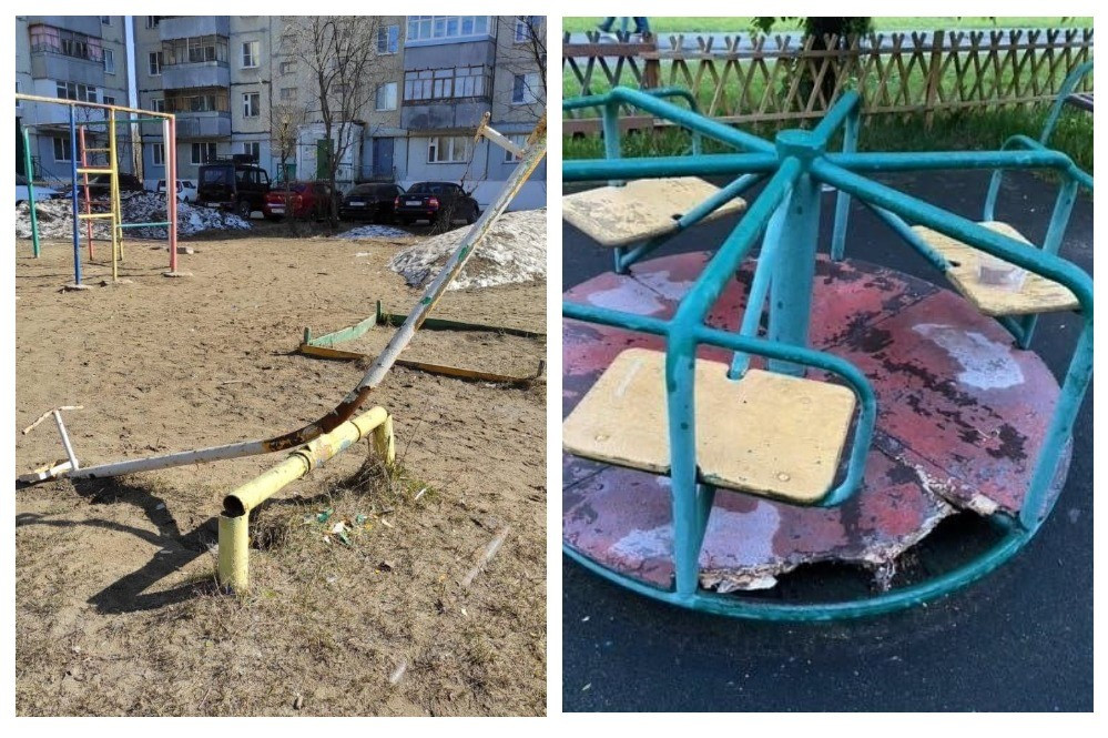 Среди проблем – торчащие из деревянных конструкций гвозди, ржавые железные горки и сломанные качели. Например, в Ростове-на-Дону на площадке ребёнку оторвало подушечку пальца на карусели.