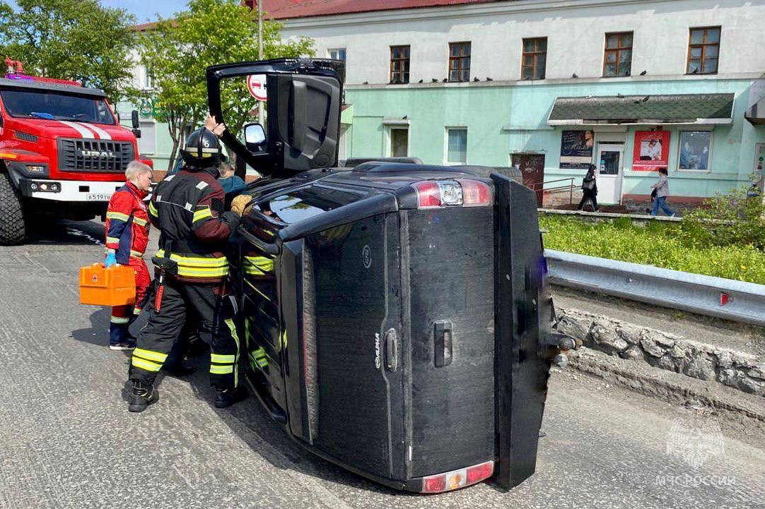 Утром в Североморске на перекрёстке улиц Северная Застава и Советская произошло ДТП. Автомобиль Mazda BT-50 совершил на дорожный бордюр и опрокинулся на левый бок.