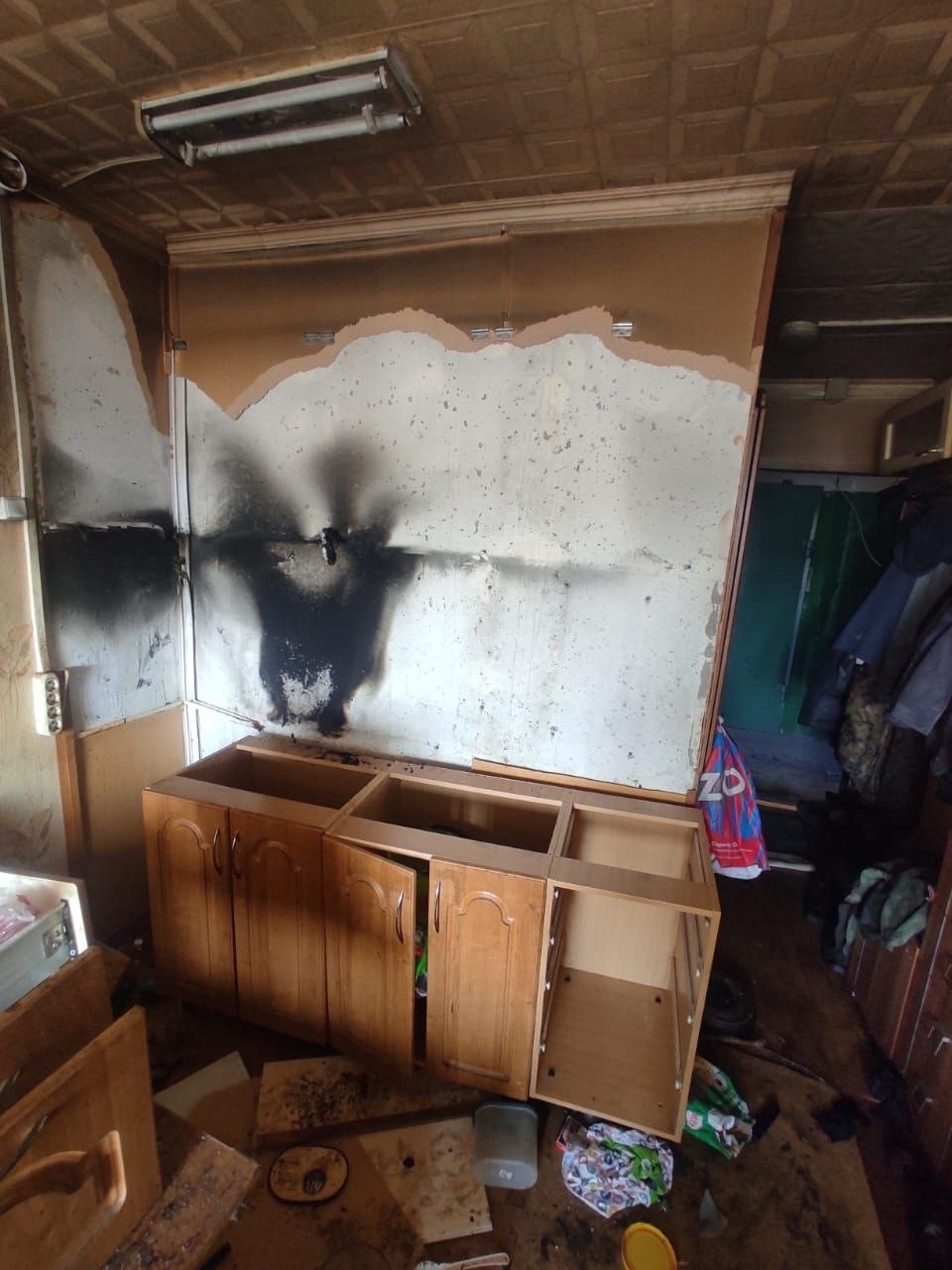 В результате пожара в одной из квартир сгорел кухонный гарнитур. Стены и потолок закоптились. Пожарные вскрывали дверь механизированным инструментом.