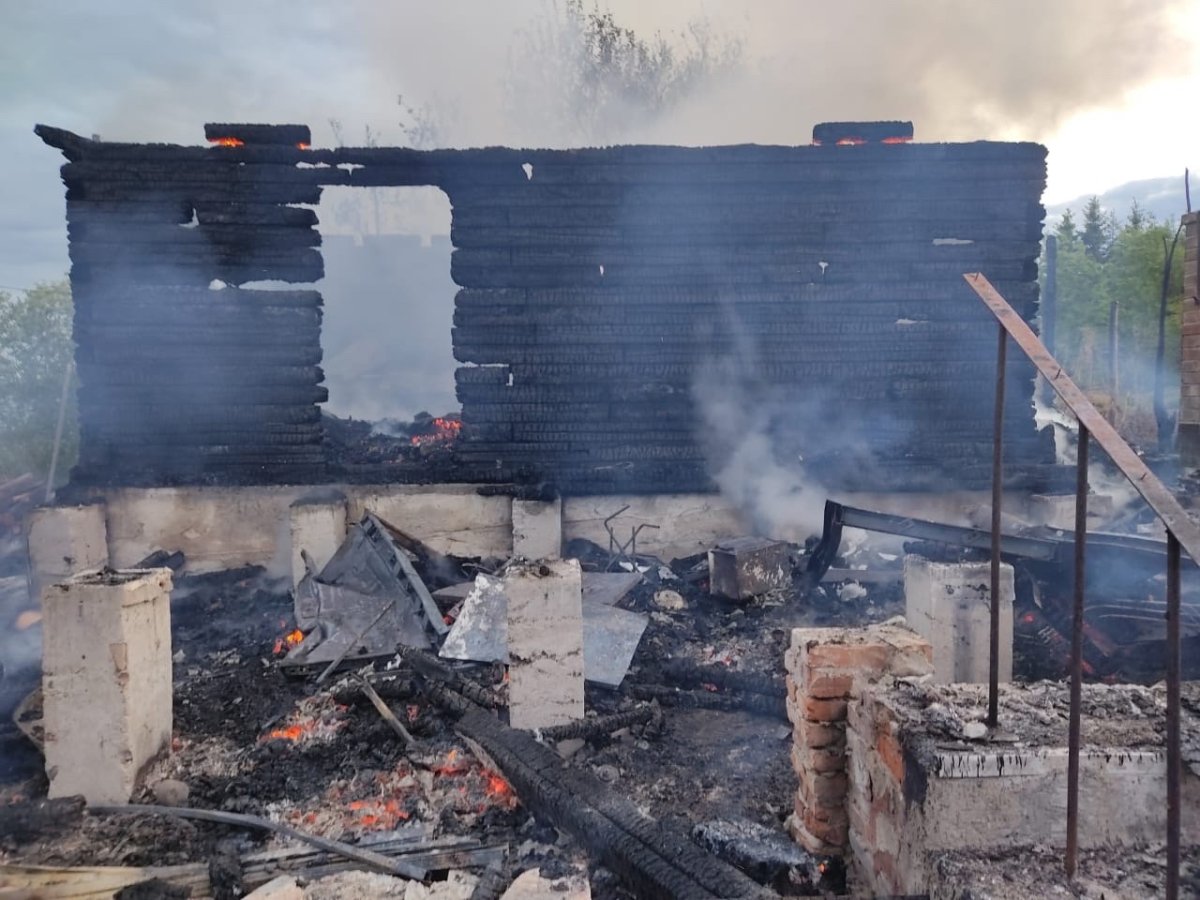 Двухэтажный деревянный дом с пристройкой и имуществом обгорели, крыша и второй этаж обрушились