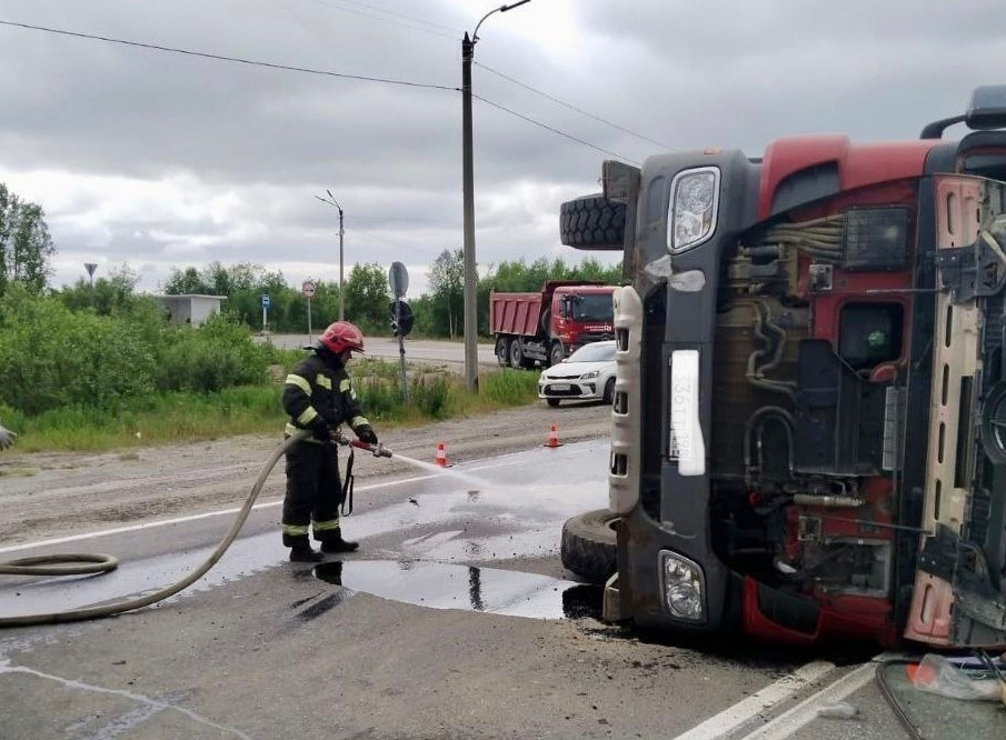 В обед в пятницу, 7 июля, на 13-м километре автодороги Апатиты-Кировск произошло опрокидывание грузового автомобиля Mercedes-Benz. Сообщение об этом поступило на пульт дежурного диспетчера пожарной охраны в 11.32.