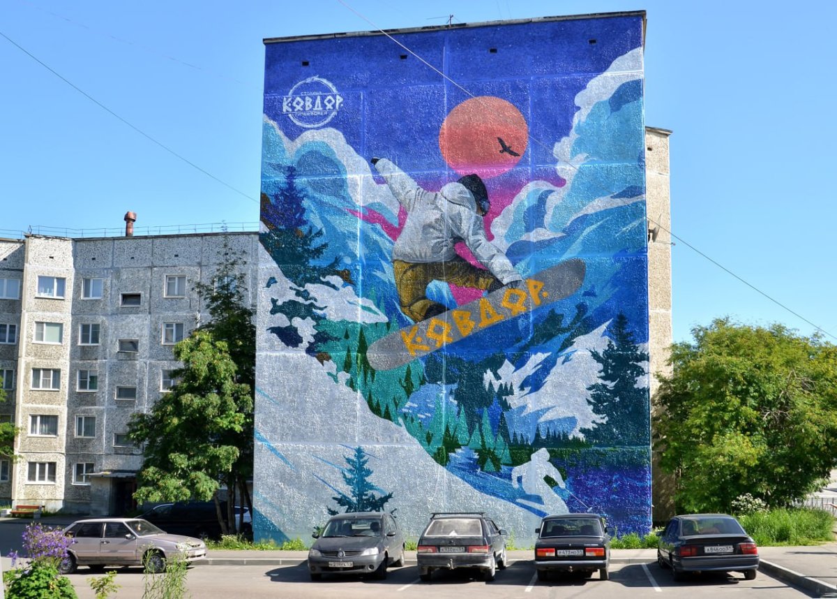“Эти два фасада дополняют мурал с оленем, созданный в прошлом году. Мы стремились выдержать стилистику. Были разные варианты эскизов, с разными животными. Но решили добавить человека. Поскольку здесь многие увлекаются сноубордом, горными лыжами, проходят спортивные активности предложили вариант со сноубордистом”, - рассказывает Сергей Акрамов.