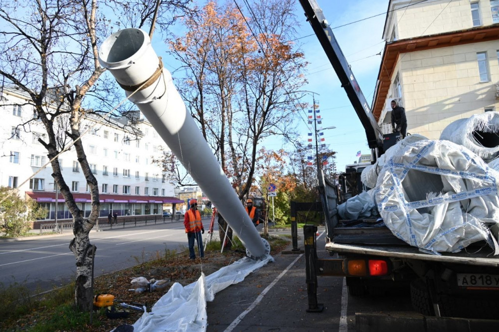 В центре Мурманска начались работы по установке опор для светодинамических перетяжек. Монтаж опор будет осуществляться преимущественно с тротуаров.