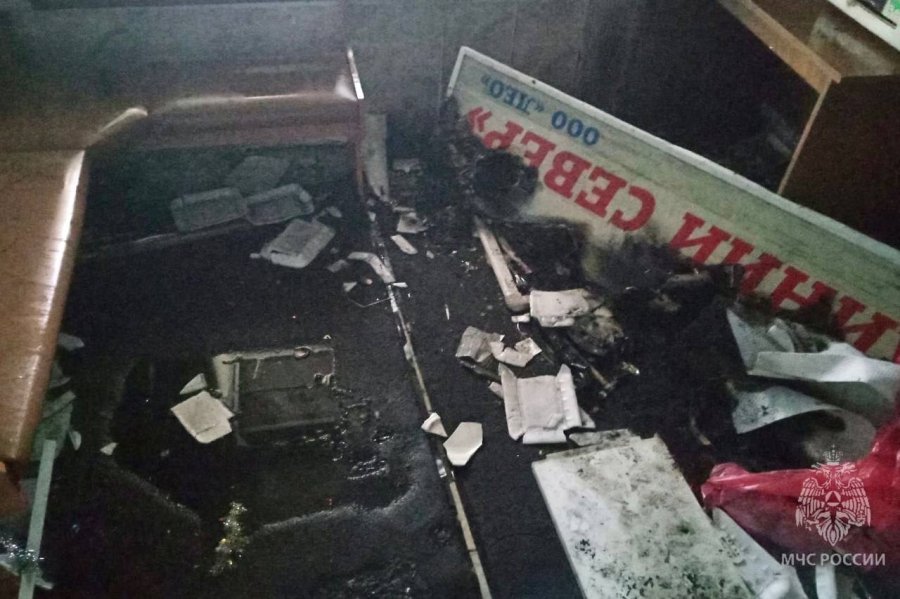 В результате пожара обгорел письменный стол и вывеска. Причина возгорания устанавливается.