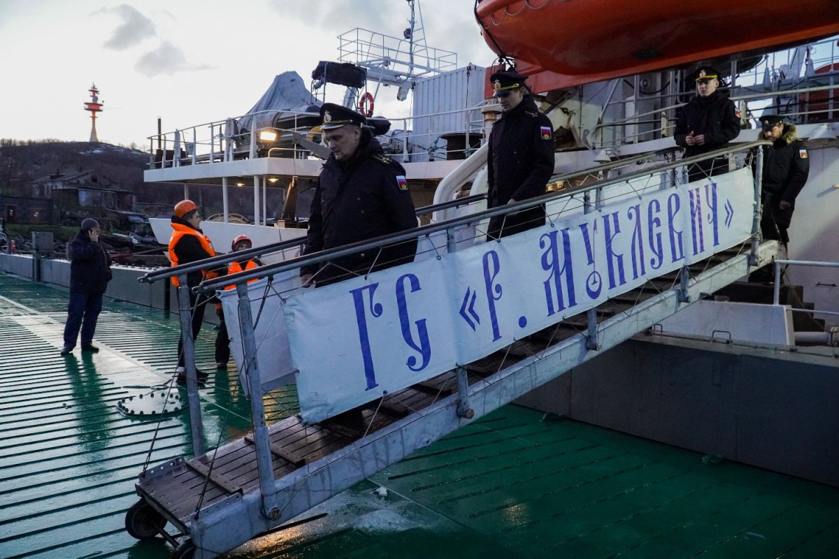 На причале «Ромуальда Муклевича» встречали начальник регионального центра управления обороной Российской Федерации штаба Северного флота контр-адмирал Сергей Артамонов, офицеры управления гидрографической службы Северного флота, родные и близкие моряков.