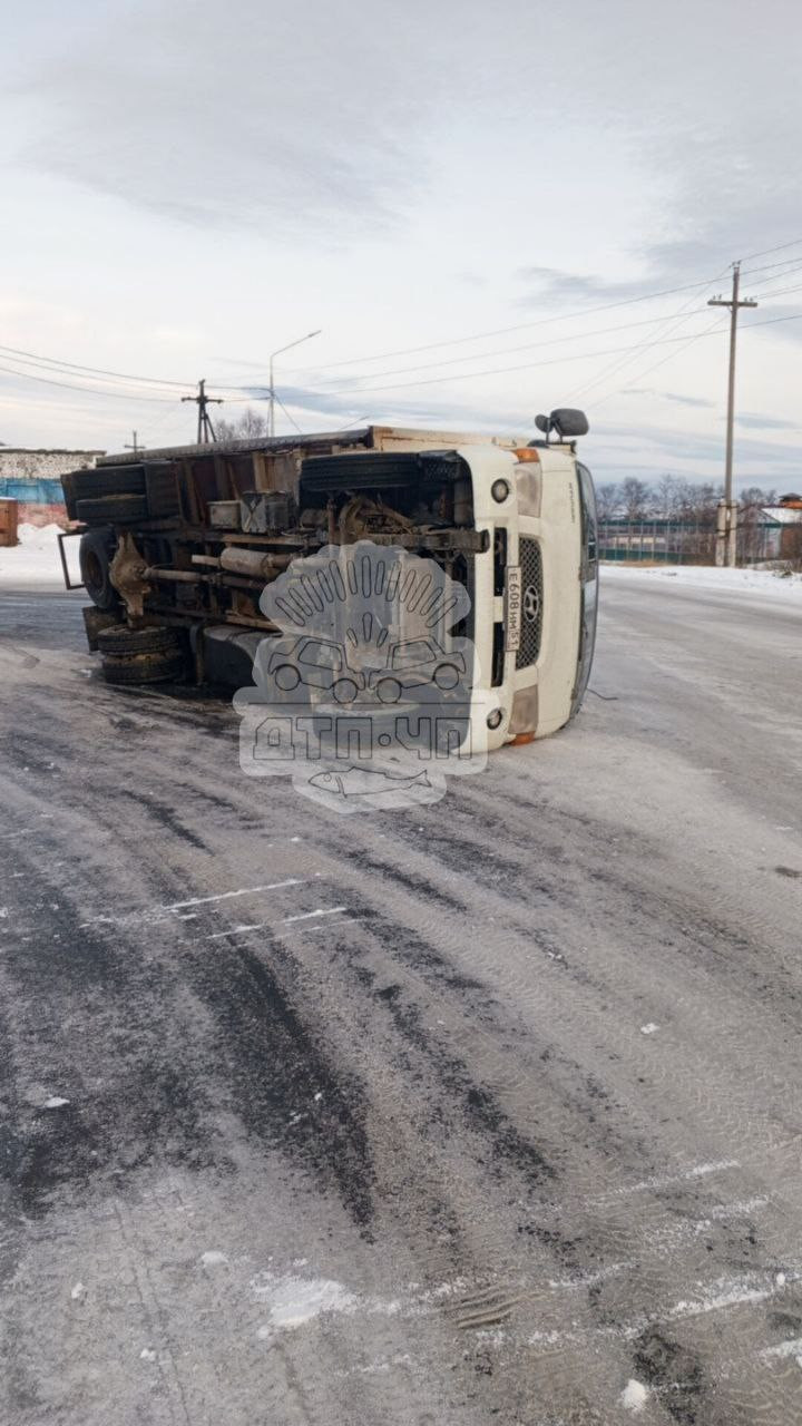 В Печенге в районе перекрестка улицы Стадионная – автоподъезд к Лиинахамари грузовой автомобиль Hyundai опрокинулся при спуске.