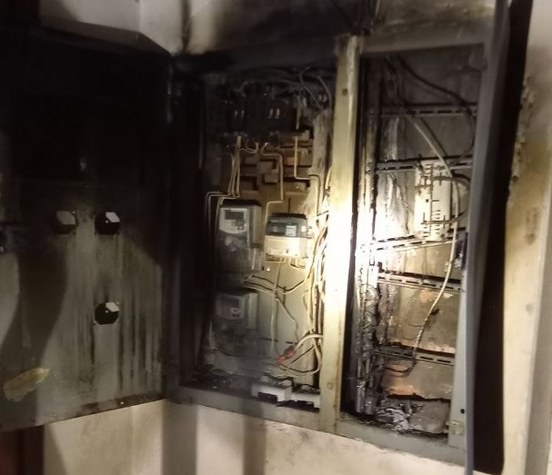 В результате пожара между этажами в двух электрощитовых обгорела электропроводка и электросчетчики. С верхних этажей дома эвакуированы двух человек.