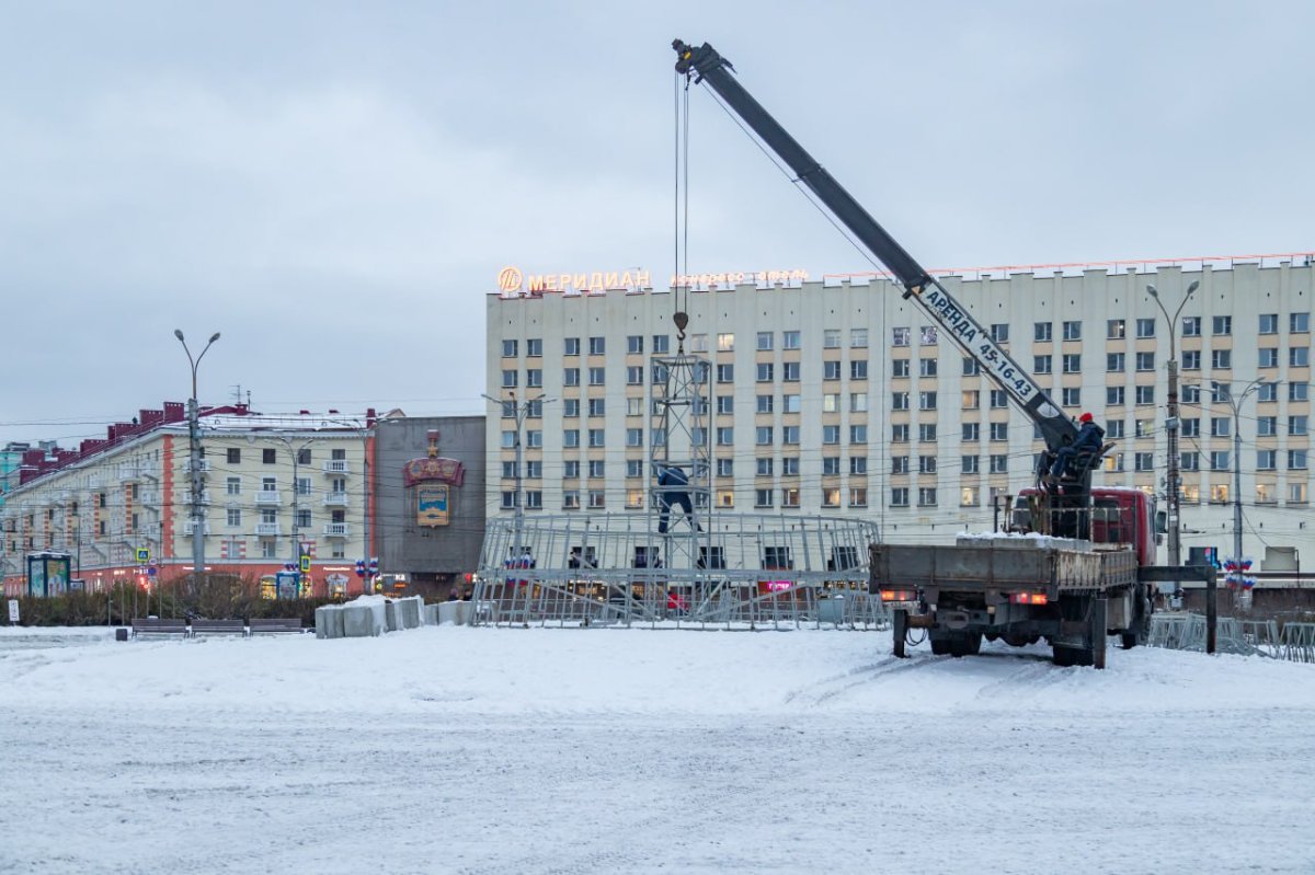 В центре Мурманска начались работу по установке главной новогодней ёлки города. Как сообщил ИА “Би-порт” информированный источник, открытие ёлки запланировано на 9 декабря.