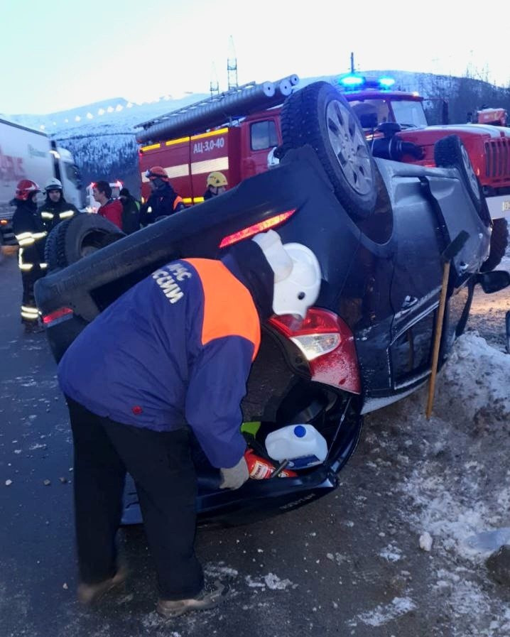 На 13 км автодороги Кировск-Апатиты опрокинулся автомобиль Hyundai. Информация о ДТП поступила сегодня в 8:47.